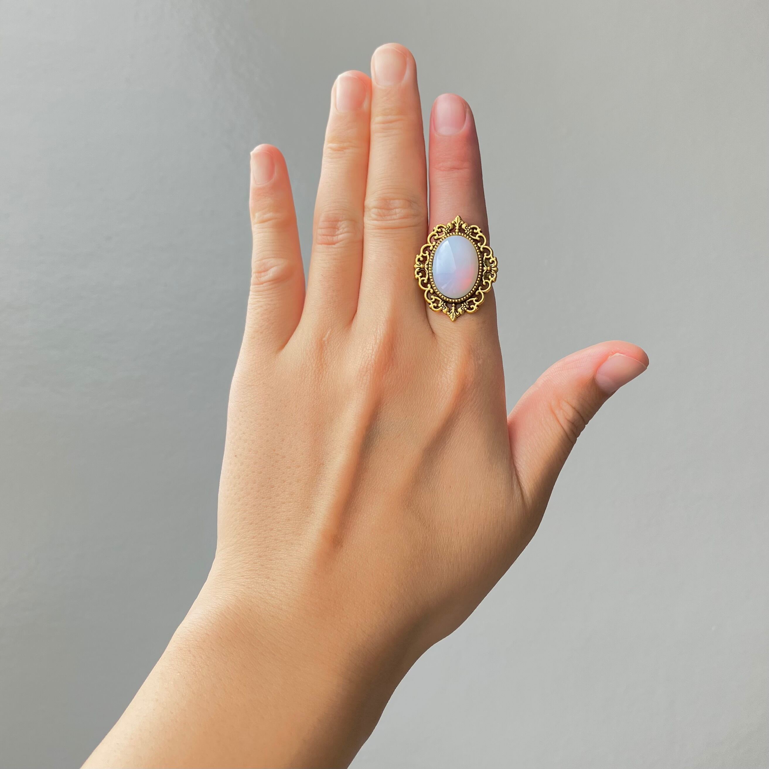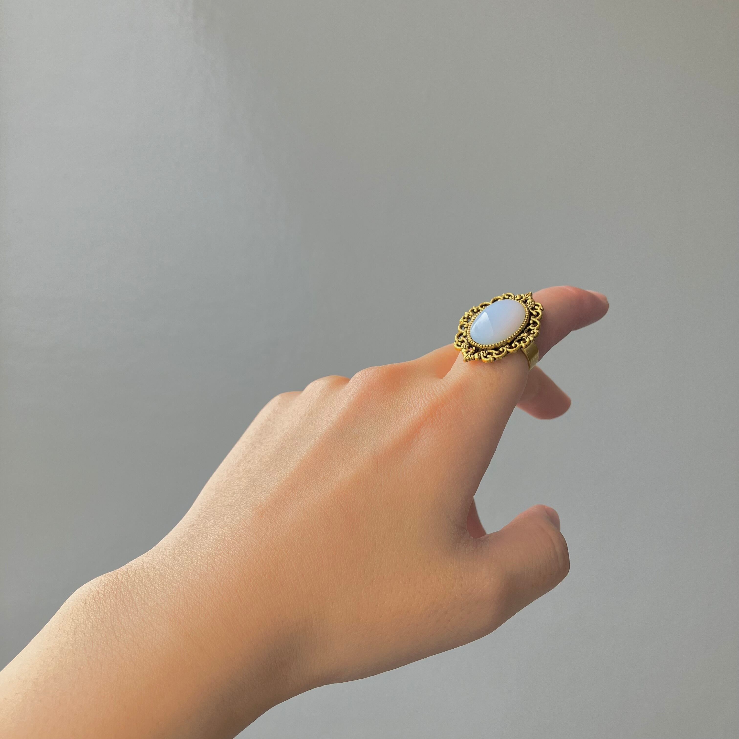 つるんとした質感の可愛いホワイトオパール風ガラスの指輪。